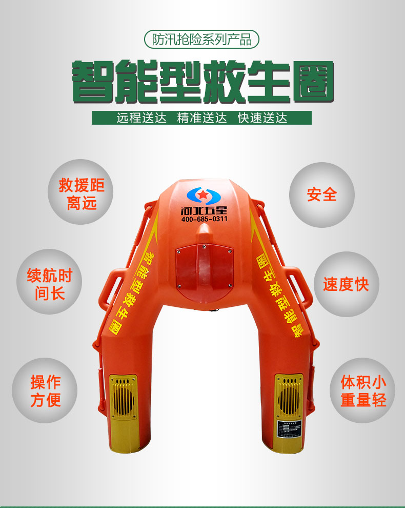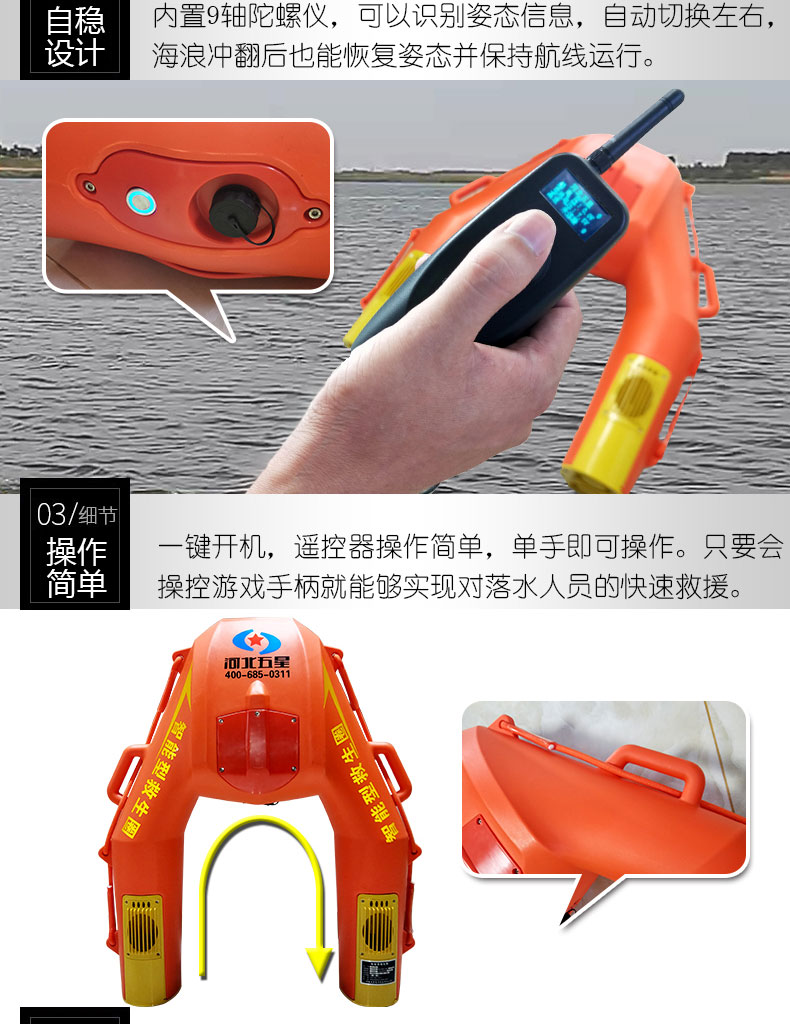 河北五星“霸王龍”WX-500型水上救生遙控機(jī)器人(智能型救生圈、智能型遙控救生圈)用于落水人員的救援,時(shí)速可達(dá)4米/秒,一旦碰到險(xiǎn)情,會以很快的速度來到你身邊。智能型救生圈操作簡單,只要會操控游戲手柄就能夠?qū)崿F(xiàn)遠(yuǎn)距離、快速、精準(zhǔn)送達(dá),實(shí)現(xiàn)對落水人員的快速救援。