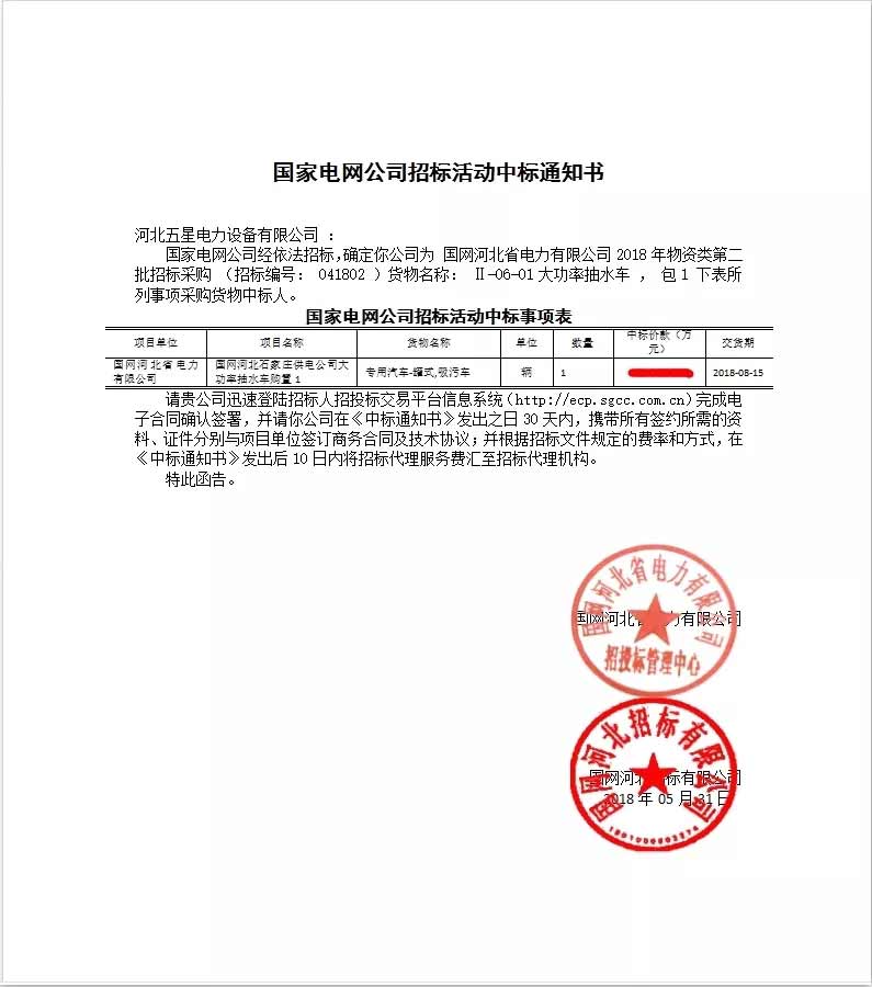 國(guó)家電網(wǎng)公司經(jīng)依法招標(biāo),確定河北五星公司為國(guó)網(wǎng)河北省電力有限公司“”2018 年物資類第二批招標(biāo)采購(gòu) (招標(biāo)編號(hào): 041802 )”項(xiàng)目中,河北五星研制生產(chǎn)的“大流量應(yīng)急搶險(xiǎn)排澇車”一舉中標(biāo)?。?/span>
